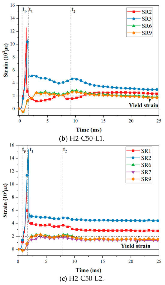 Under the impact load, the bending moment on the interface made the interface open, the upper steel plate and the RC foundation separated, and the axial tension on the steel plate was gradually transferred to the tensile dowels. The force transfer process was accomplished via concrete compression struts formed by the dowels, headed studs, angles, tie channels, and the steel plate [18,20]. The stress was subsequently transmitted through the dowels. The strain distribution of dowel rebars and steel plates was measured in this experiment; the arrangement of the measuring points is shown in Figure 4. According to the data obtained from the strain gauges, the strain gauges near the interface (SR1–3 and SR6–8) of the three specimens yielded. As for the remaining three strain gauges, only SR9, which was located in the impact area on the back impact side of the specimens, also yielded. Figure 14 presents the strain–time history curves of yielding strain gauges on three test specimens. Partial strain gauge failure occurred during impact tests, so those curves were not plotted. Specifically, gauges SR1 and SR2 in Specimen H2-C30-L1, SR1 in Specimen H2-C50-L1, and SR3 in Specimen H2-C50-L2 were damaged. This indicated that the upper dowel rebars at the interface were more seriously affected by the impact. Three key time points (tp, t1, t2) were defined, where tp was the time at which the impact force reached its peak; t1 was the time at which the hammer contacted the SC wall again; t2 was the time at which the hammer reached its maximum deflection.