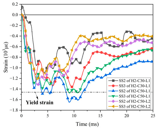 Six strain gauges (SS1–6) were placed on the bottom steel plate of the test specimens, and the test results showed that most of the strain gauges on the steel plate did not yield. Figure 15 showed the strain time history curves of strain gauges SS2 and SS3 at the interface of the bottom steel plate. As seen in Figure 15, during the impact process, the bottom steel plates of all specimens remained in a compressed state. As expected, the maximum strains and residual strains of the bottom steel plate in specimen H2-C50-L1 were obviously larger than those in specimen H2-C50-L2, which was consistent with the trend seen in the bottom dowel rebars. The steel plate of specimen H2-C50-L1 yielded, probably because the peak impact force of this specimen was the highest among all specimens.