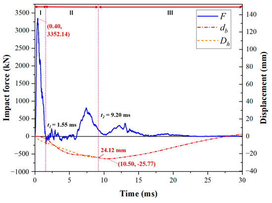 All test specimens presented similar behavior in terms of impact force, deflection, and strain over time responses. The typical impact force as well as the deflection versus time curves of the test specimens are shown in Figure 16. Three impact response stages can be distinguished, named inertial, loading, and unloading stages, as defined in previous studies [31,32]. Three key time points (tp, t1, t2) were defined in Section 3.3.
