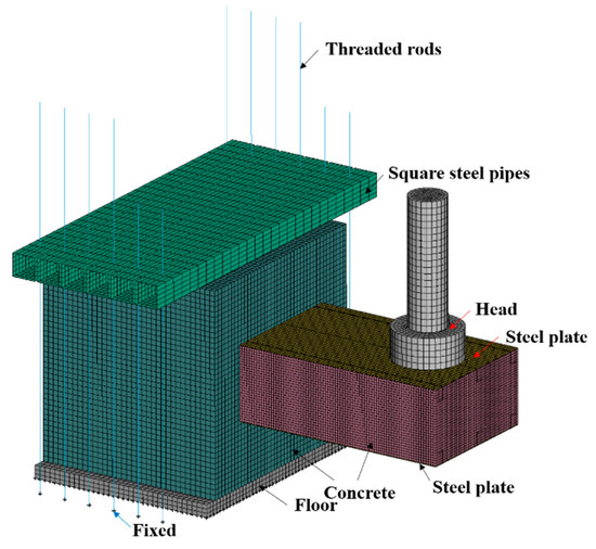 In this study, the ANSYS/LS-DYNA 14.0 software was used to perform the FE model of the test specimens subjected to impact loading [33]. As illustrated in Figure 17, the FE model was developed according to the settings of the impact test. Solid element (Solid 164) was used for the concrete, hammer, and floor. The steel plates, stiffening angles, tie channels, and square steel pipes were modeled using the Belytschko–Tsay shell element (Shell 163) [31,32]. Headed studs, dowel rebars, RC foundation rebars, and threaded rods were simulated using the Hughes–Liu with cross-section integration beam element (Beam 161) [15,34]. To balance accuracy and computation time, the mesh size of steel plates, concrete of SC wall, headed studs, stiffening angles, tie channels, and dowel rebars was determined to be 10 mm, a rough size of 50 mm was used for the rebars, square steel pipes, and threaded rods, while the mesh size of 20 mm was chosen for other components.