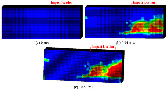 Damage evolution of H2-C50-L2: (a) 0 ms; (b) 1.03 ms; (c) 9.47 ms.