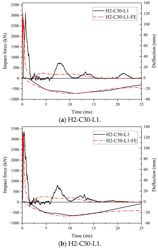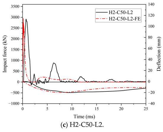 (3) Compared to H2-C30-L1, H2-C50-L1 (C50 concrete) demonstrated enhanced impact resistance, achieving a 7.5% higher peak impact force alongside 12.3% and 26.3% reductions in maximum and corresponding residual deflections, respectively.