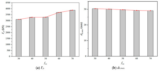 Figure 22 showed the influence of concrete compressive strength (fcu) on the Fp and db,max. In general, as the fcu increased, the Fp increased and the db,max slightly decreased. The reason was that the flexural resistance of SC wall-to-foundation connections was enhanced with the increase of fcu. For the numerical models with the impact energy of 14.7 kJ, the Fp increased by 24.94% and the db,max decreased by 4.18%, when the fcu rose from 30 MPa to 70 MPa. It was found that the impact resistance of SC wall-to-foundation connections was improved by enhancing the compressive strength of concrete.