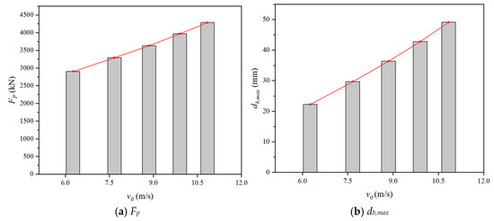 By changing the impact velocity (v0), the impact responses of numerical models were shown in Figure 23. As shown, both the Fp and the db,max increased with the increasing v0. Furthermore, when the v0 varied from 6.26 m/s to 10.84 m/s, the Fp increased by 47.61% and the db,max increased by 120.97%, indicating that the Fp and db,max increased significantly with the increase of v0. This was because the higher impact velocity applied to the SC wall-to-foundation connection increased impact energy and amplified strain-rate effects in concrete. A similar phenomenon was also found in Ref. [31].