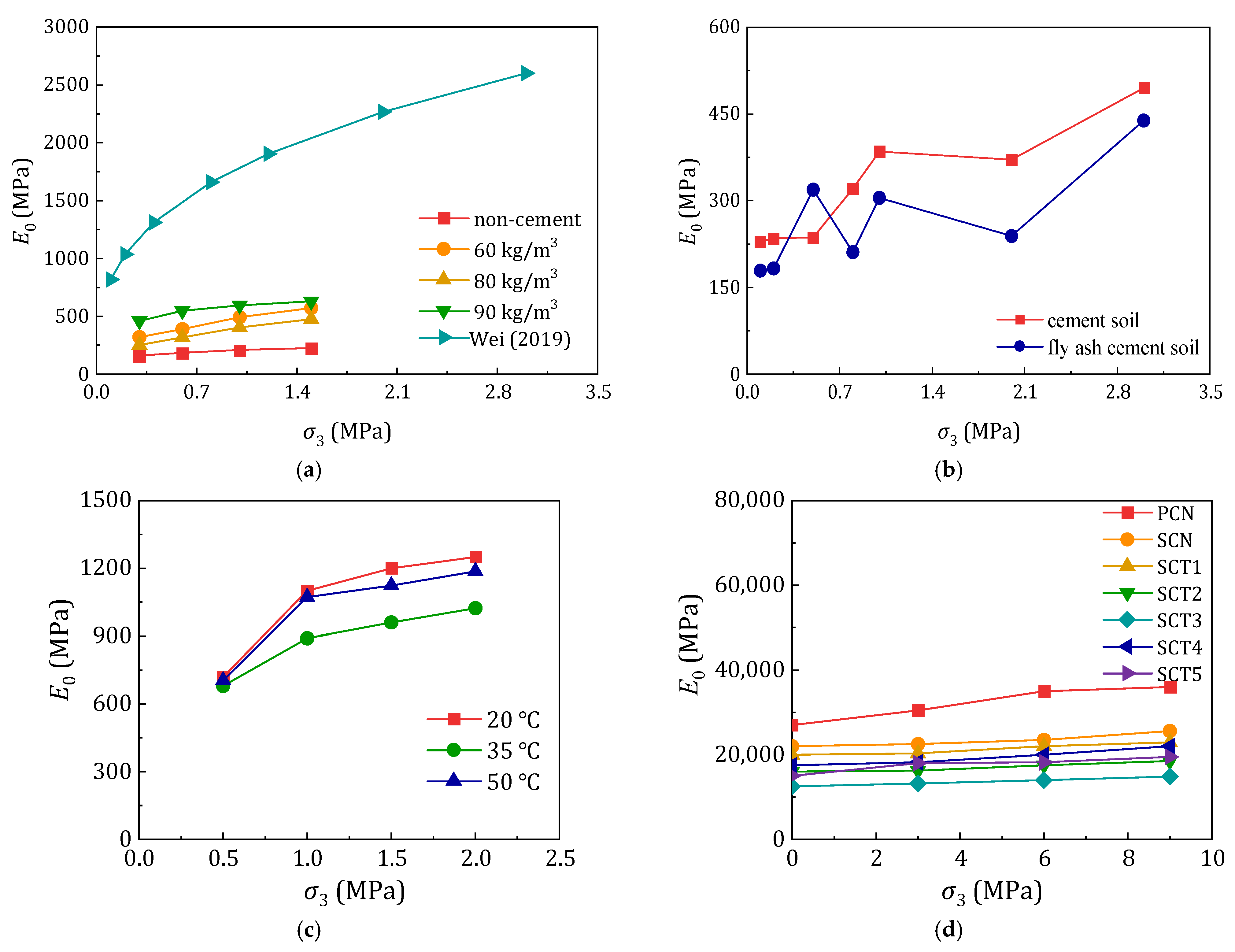 - Lohani, T.N.; Kongsukprasert, L.; Watanabe, K.; Tatsuoka, F. Strength and Deformation Properties of Compacted Cement-Mixed Gravel Evaluated by Triaxial Compression Tests. Soils Found. 2004, 44, 95–108. [Google Scholar] [CrossRef]