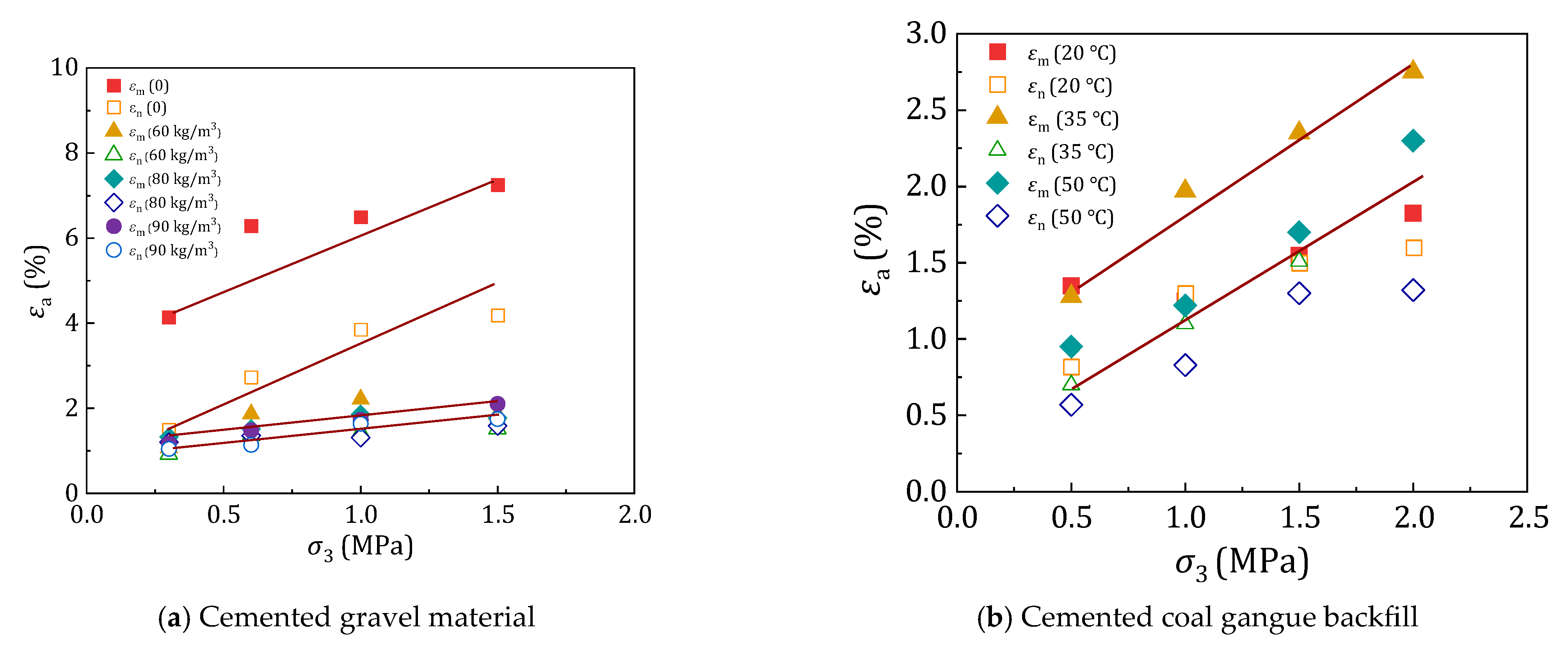 - Liu, W.Z.; Hu, Z.J.; Liu, C.; Huang, X.P. Mechanical properties under triaxial compression of coal gangue-fly ash cemented backfill after cured at different temperatures. Constr. Build. Mater. 2024, 411, 134268. [Google Scholar] [CrossRef]