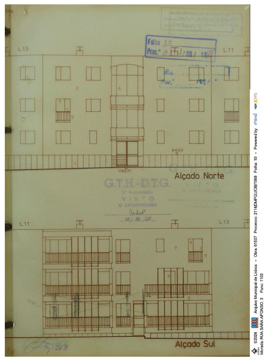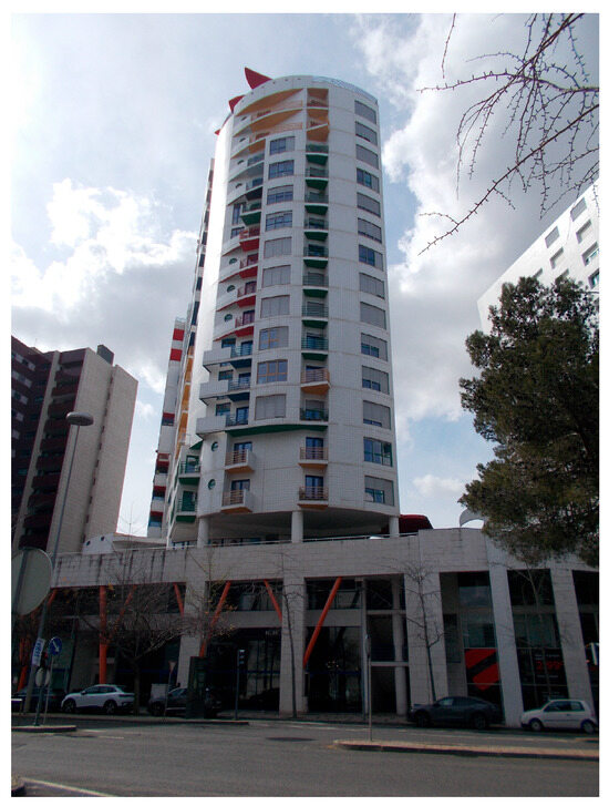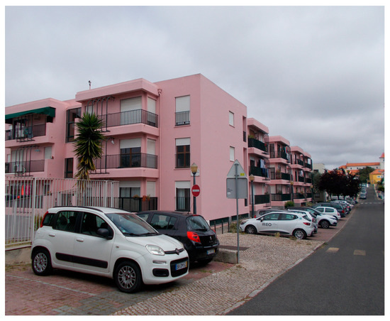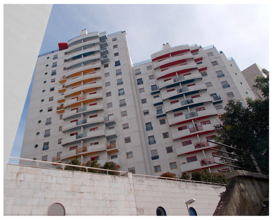Figure 11). Thus, the collective dwellings of cooperative promotion of Justino Morais, in Caselas, reached their own earned merit in the recognized social housing in Lisbon, alongside with other iconic works such as the Pink Panther Social Housing Complex (1972–1979) of Gonçalo Byrne and António Reis Cabrita. Additionally, their combination with the equipment existent in the neighborhood, the services, and Monsanto Park’s green area provides a vital perspective of the public space and encourages the intense use of the exterior space. The pedestrian paved space is kept safe from the circulation of vehicles. The buildings are well integrated, presenting an urban continuity with the pre-existing edifices.