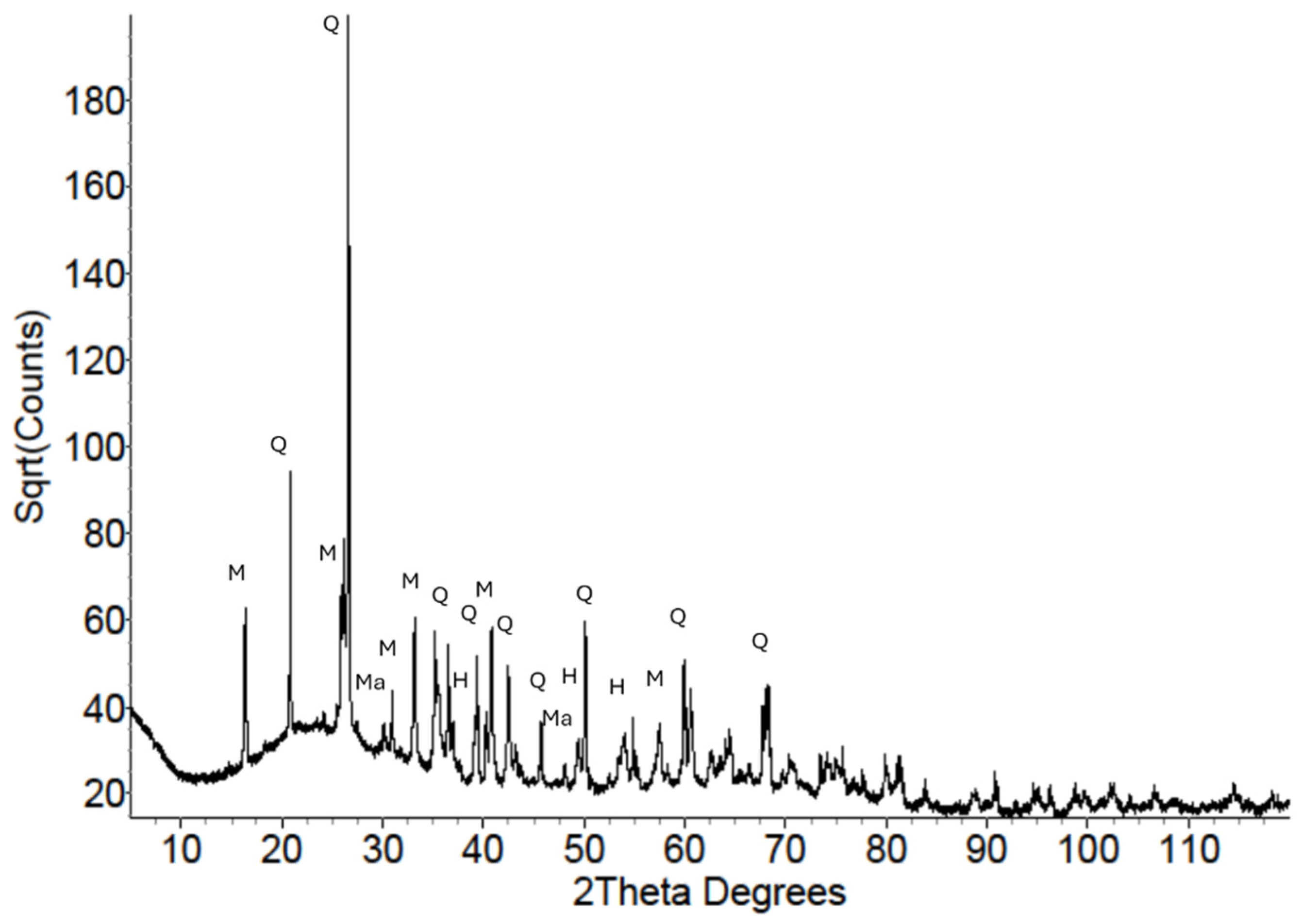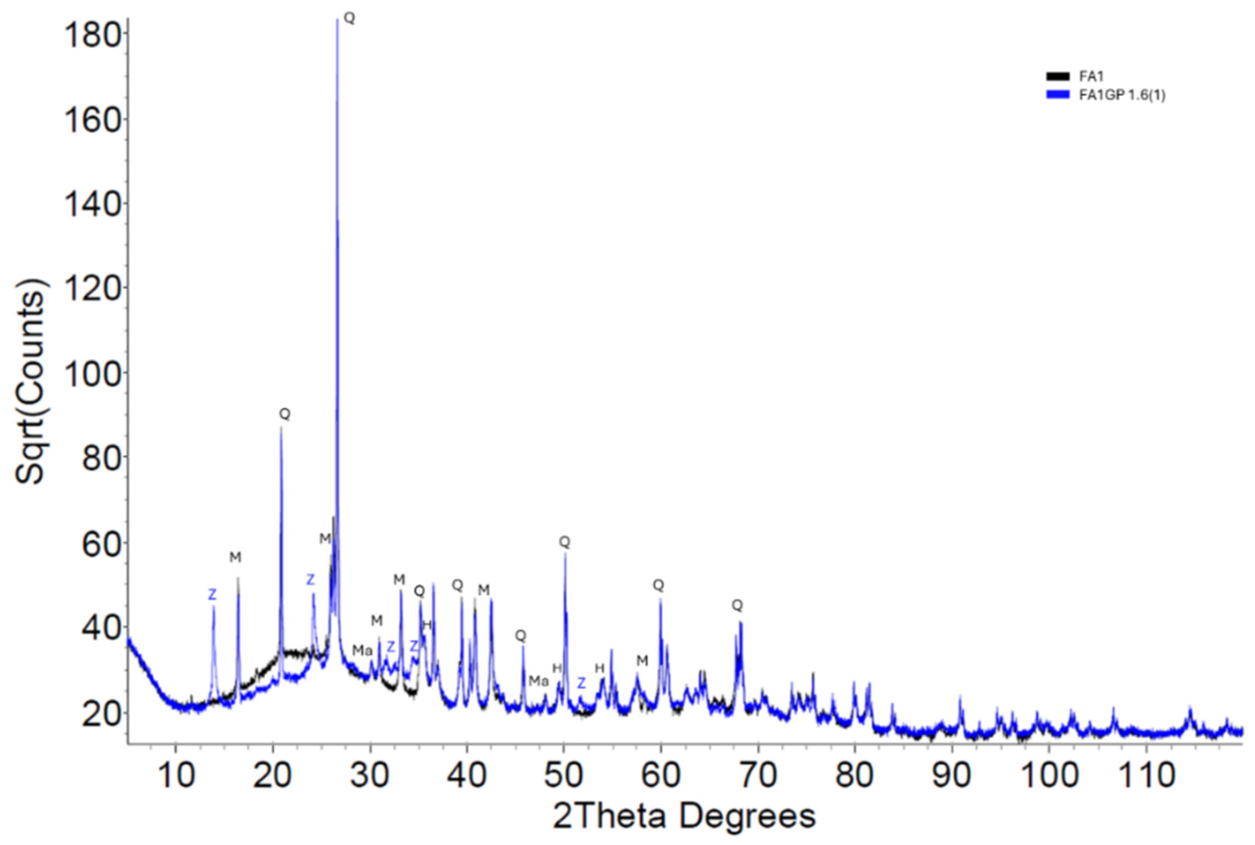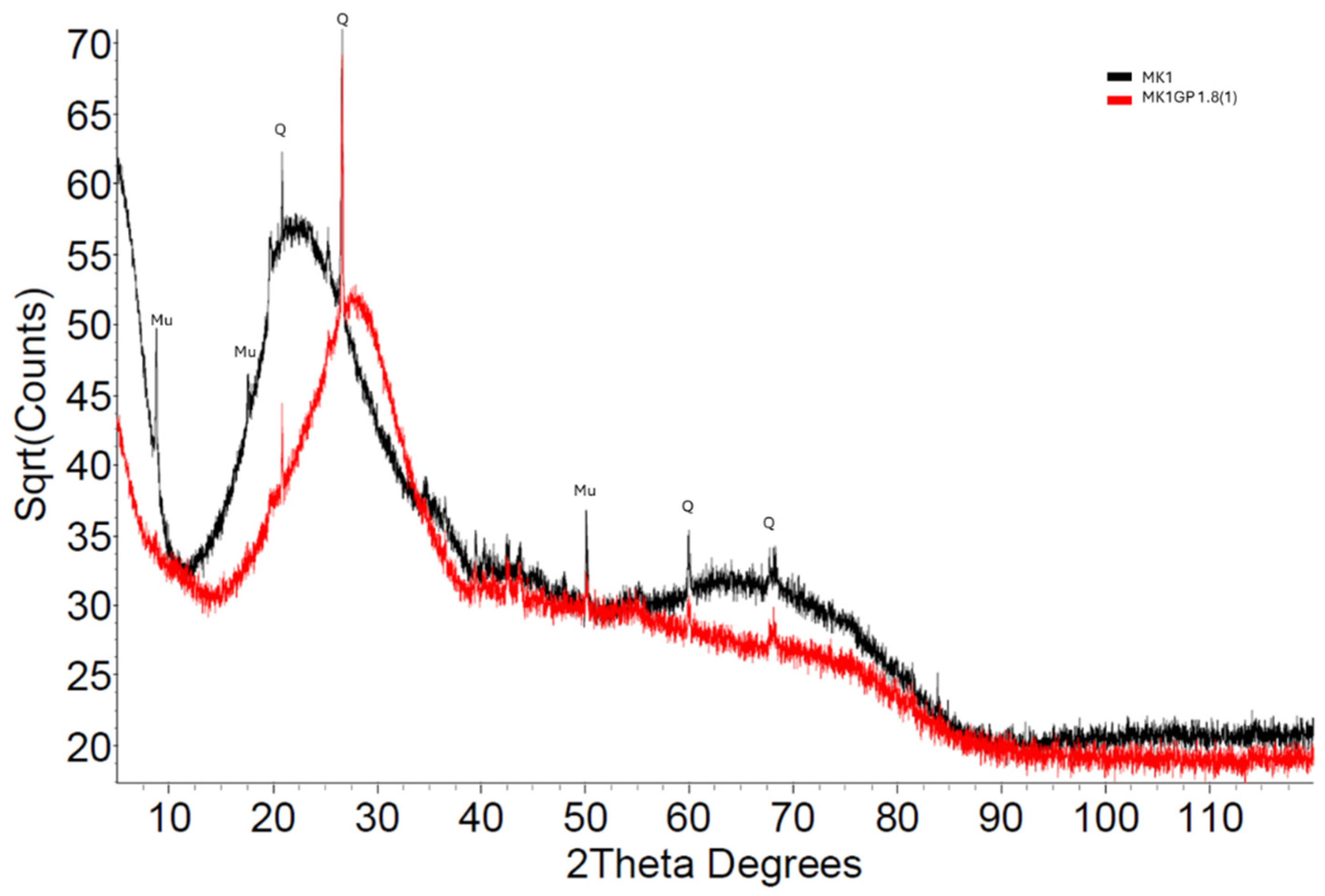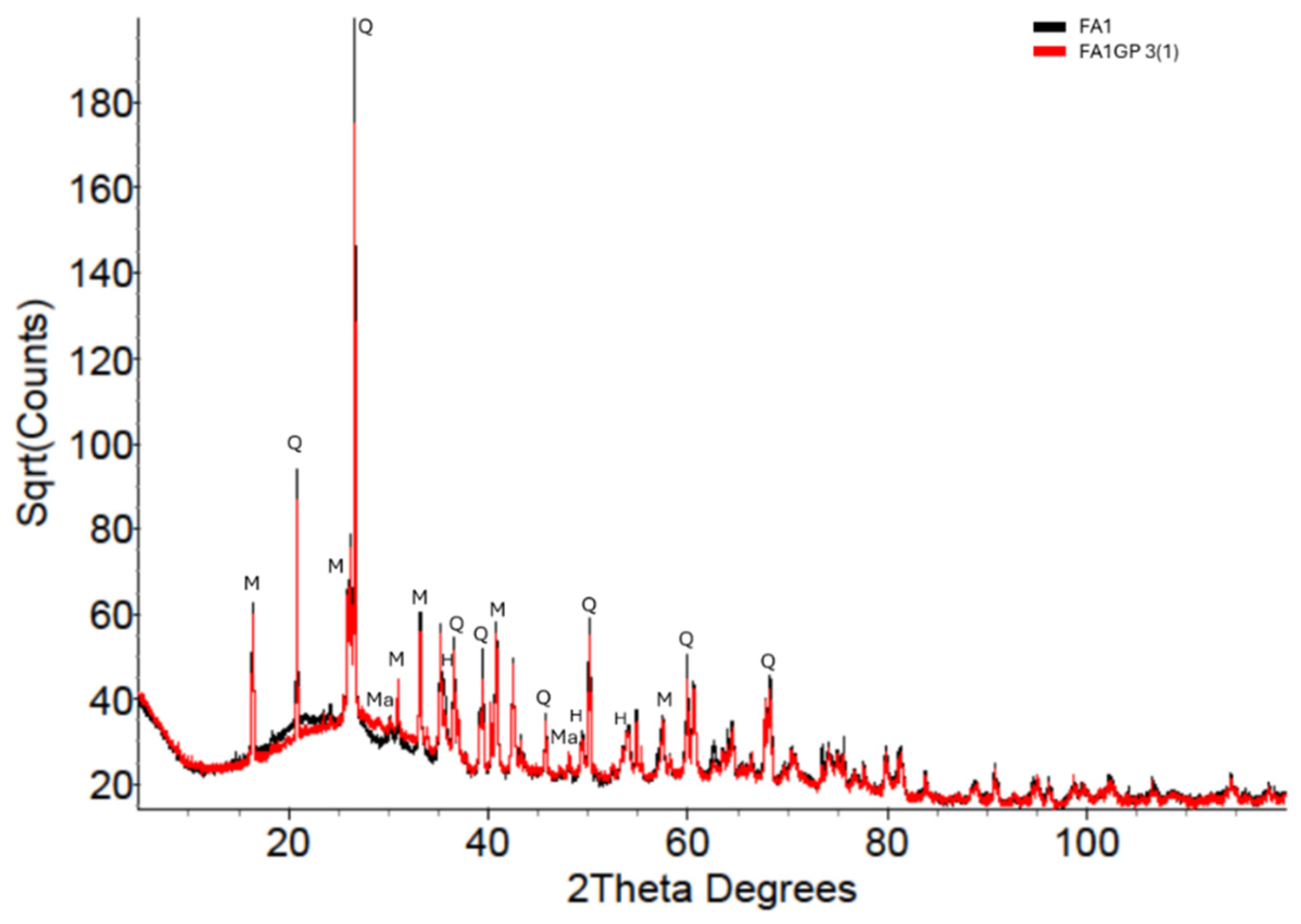 - van Riessen, A.; Jamieson, E.; Gildenhuys, H.; Skane, R.; Allery, J. Using XRD to Assess the Strength of Fly-Ash- and Metakaolin-Based Geopolymer. Materials 2025, 18, 2093. [Google Scholar] [CrossRef]