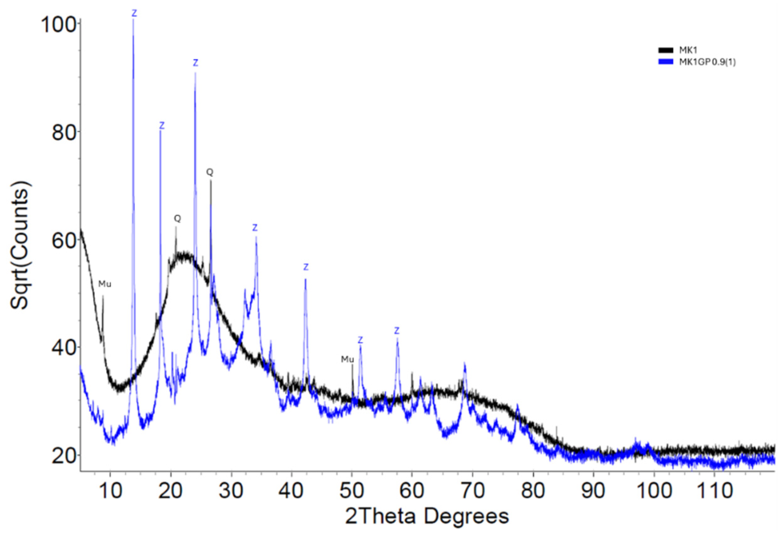 - Williams, R.; Hart, R.; van Riessen, A. Quantification of the extent of reaction of metakaolin based geopolymers using XRD, SEM and EDS. J. Am. Ceram. Soc. 2011, 94, 2663–2670. [Google Scholar] [CrossRef]
