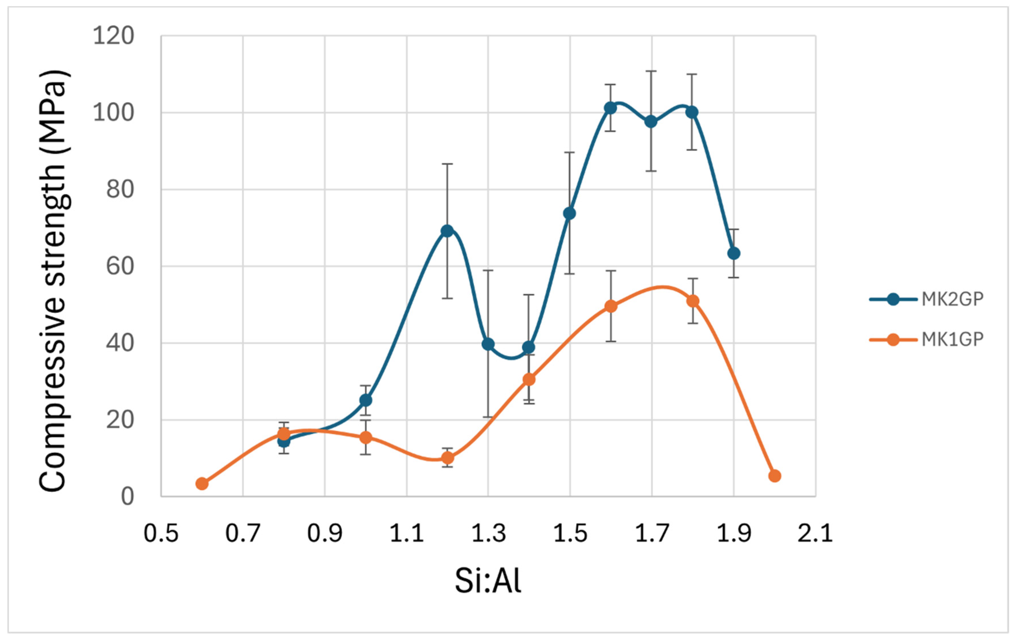 - In all cases investigated, the strength peaks of the geopolymers were present for Si:Al values greater and less than the Si:Al of the precursor aluminosilicate.