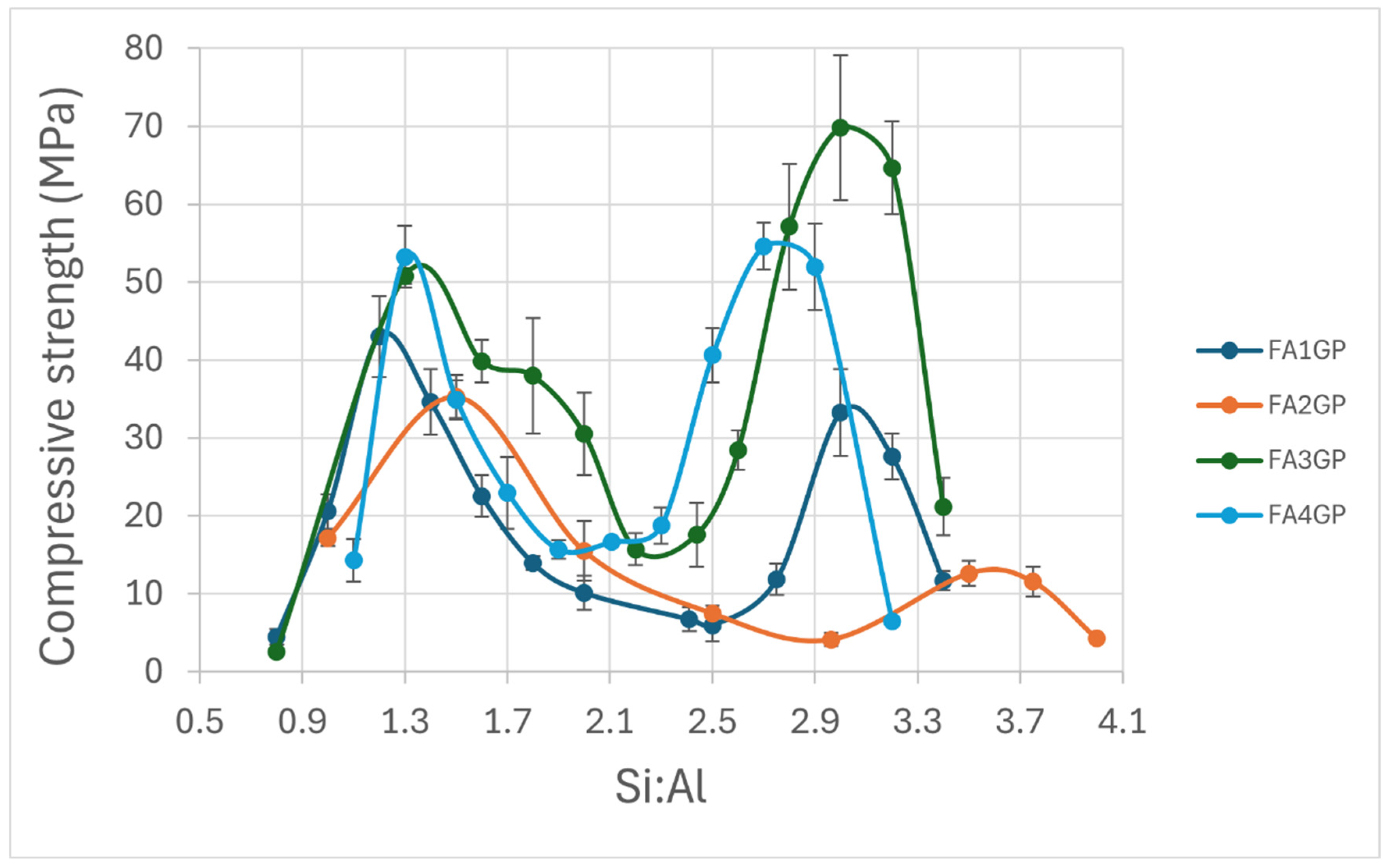 - Four fly ash-based geopolymers and two metakaolin-based geopolymers with a wide range of Si:Al ratios have revealed a novel feature of dual compressive strength peaks.