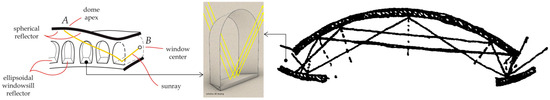 The integration of clerestory windows beneath domes has historically served as a fundamental daylighting strategy, particularly within religious buildings, where it exemplifies early approaches to passive lighting design [17]. This technique is prominently illustrated in the architectural composition of Hagia Sophia. Scholars such as Gervase Mathew and Thomas Whittemore have highlighted the purposeful interaction between the dome’s curved geometry and the reflective surfaces conceived by Anthemius. These elements work in concert to capture and redistribute natural light, creating a diffused, luminous environment beneath the dome [18,19]. The use of dual reflectors enhances this effect, producing a transcendent visual experience that reinforces the symbolic elevation of the sacred space above the earthly domain.