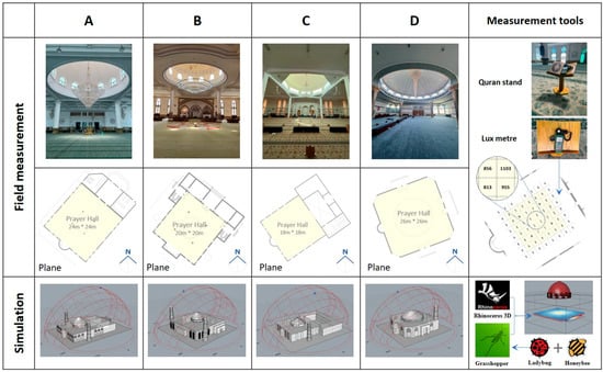 This study employs a mixed-method approach that integrates on-site measurements, digital simulations, and comparative analysis to assess the daylighting performance of mosque prayer halls with domed roofs. The primary objective is to assess the accuracy and reliability of the RADIANCE simulation plugin for Grasshopper by comparing its outputs with actual daylight levels recorded during field measurements. This validation step is crucial to ensuring that any subsequent daylighting improvement strategies are grounded in reliable data and reflect real-world lighting conditions.