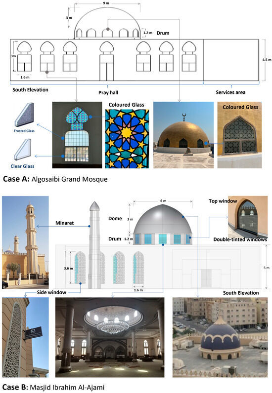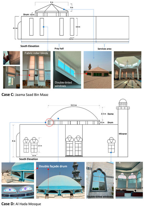 Each selected mosque includes a central prayer hall topped with a dome and surrounded by clerestory or upper-level windows intended to facilitate daylight penetration. These prayer halls also share consistent architectural characteristics, such as a square layout and orientation toward the Qiblah, indicative of a unified regional design approach. The four case study mosques, presented in Figure 3, are as follows: A: Alotaibi Grand Mosque; B: Masjid Ibrahim Al-Ajami; C: Jaama Saad Bin Maaz; and D: Al Hada Mosque.