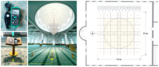 Field measurements were conducted in the four selected case study mosques to evaluate the daylight levels within the prayer halls. These measurements focused on the central areas of the prayer halls, specifically the space beneath the domes. A section measuring 13 m × 13 m was chosen to evaluate the daylight performance of the top windows. Hourly illuminance value measurements were taken on a grid with a spacing of 2.0 m × 2.0 m divided into 36 squares of equal dimensions, as shown in Figure 4, positioned at a reading level of 0.35 m above the ground (at the Quran stand level) [27]. Except for the horizontal and vertical axes, they were taken on a grid with a spacing of 1.0 m × 1.0 m. The levels of illumination were then measured at the center of each square using the lux meter. The measurements campaign was limited to four days (one day for each case), from 19 to 22 September, and measurements were conducted three times a day during the noon prayer period at 10:30, 12:00, and 13:30. Daylight was measured under a clear and sunny sky, and electric lights were turned off during the measurements.
