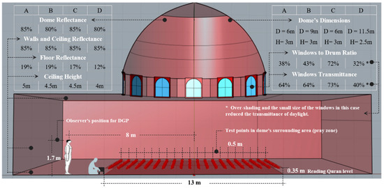 The results of the RADIANCE version 5.4a simulation were compared with the field measurements during the same period of 10:30–13:30 on 21 September to validate the simulation model. The validated simulation models were then used to assess the daylight performance of the proposed shading devices on 21 September, 21 June, and 21 December. Rhinoceros 3D was utilized to model the four chosen case study mosques considering the design and material characteristics of existing mosque buildings. The RADIANCE engine [28] in Grasshopper is employed to assess the daylight performance of shading devices operated through the “Honeybee and Ladybug” environmental software plugins for Grasshopper [29]. The analysis plane was set up at 0.35 m above the floor, with a 13 m × 13 m grid size to match the measurement setup. Adjacent test points were 0.50 m apart in the simulation. The estimated reflectance values of various elements such as walls, dome ceiling, and the light transmittance of windows for the simulation models are detailed in Figure 5 [30,31,32]. Weather file data sets (EPW) were used for the location of the city of Dammam (Eastern Province) in Saudi Arabia.