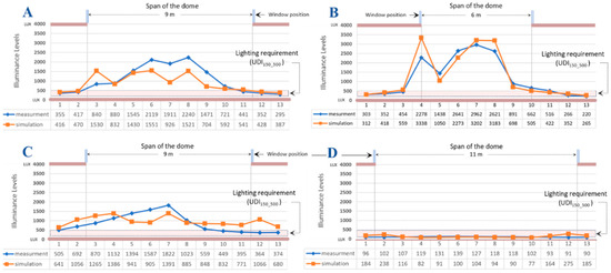The cross-sectional view of the comparison between measured and simulated illuminance levels for four cases during the noon prayer time on 21 September: (A): Case A; (B): Case B; (C): Case C; and (D): Case D.