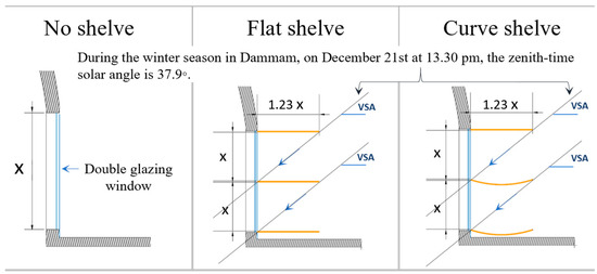 The improvement approach incorporated the implementation of vacuum double glazing, which shows outstanding characteristics in improving light transmission, superior heat insulation, and thermal efficiency, as indicated in Table 1. Furthermore, informed by prior research on shading device effectiveness, two types of external aluminum light shelves—flat and curved, each with a reflectivity of 75%—were proposed to improve daylight distribution, as illustrated in Figure 7. These devices are designed to redirect incoming sunlight toward the dome ceiling, which then diffuses the light through its curved surface and distributes it more evenly within the prayer space. Both types of light shelves were evaluated in a horizontal configuration (0° tilt), with their depth calculated using Equation (1) [40]: