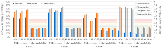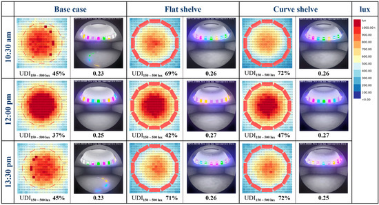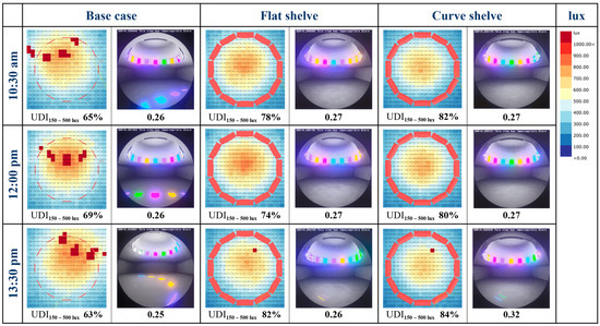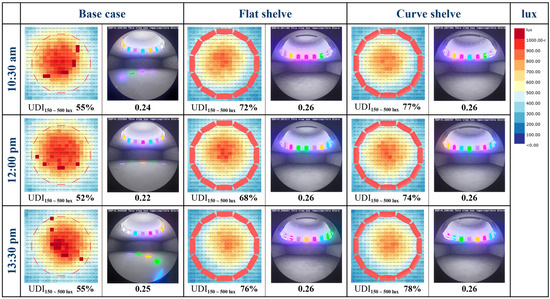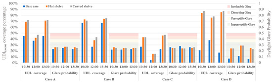 On 21 June, as shown in Figure 11 and Figure 12, at 12:00, the implementation of light shelves played a significant role in mitigating the impact of intense solar radiation, thereby minimizing excessive lighting. These light shelves have improved the percentage of useful daylight coverage in Cases A, B, and C, ranging from 5% to 10%. Notably, in Case D, the improvement increased from 39% to 77% of the coverage for the daylight illuminance range of 150~500 lux, due to the reduced exposure to intense solar radiation resulting from the smaller window size. While the proposed light shelves have demonstrated their effectiveness in mitigating the impact of intense solar radiation during periods of high solar radiation, notable improvements in the percentage of useful daylight coverage area have also been observed at 10:30 and 13:00. Specifically, in Cases A, B, and D, the percentage of useful daylight coverage has increased by 71%, 75%, and 83%, respectively. With a slight preference for curved shelves, an average increase of up to 7% has been observed. This is due to the curved shape’s distribution effect, which diffuses the received light more frequently than the flat shape’s tendency to reflect the same amount of the received light. However, in Case C, the performance of the shelves was affected by the larger windows size, as the percentage of useful daylight coverage did not exceed 48%.