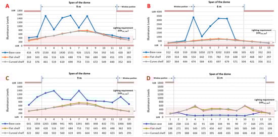 The cross-section view of a comparison of the illuminance levels of the base scenario and improved scenarios (flat and curved) on 21 September for all case studies: (A): Case A; (B): Case B; (C): Case C; and (D): Case D.
