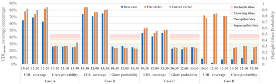 On 21 December, as shown in Figure 13 and Figure 14, the performance of the light shelves in Cases A, B, and D is almost similar during the noon prayer time. The useful illuminance coverage percentage ranges from 69% to 84%, which is considered satisfactory for ensuring visual comfort for worshippers in prayer halls. Furthermore, when evaluating glare, the daylight glare probability (DGP) results for both the base cases without shading and the suggested shading solutions are below 0.3 on most dates and times. However, on 21 June, 21 December (at three specific times), and 21 September, both light shelves generate slightly more glare (at 3% and 19%) compared to the base cases without any shading. The reason for this is that the amount of light reflected off the surface of the shelf can contribute to an increase in brightness levels. This issue will be addressed in a future study by implementing advanced shading systems.