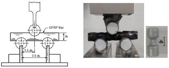 The interlaminar shear strength (ISS) test was conducted to assess the mechanical performance of GFRP bars aged under the protection of different types of concrete. The test was performed using an universal testing machine (INSTRON 2310, Pindamonhangaba, SP, Brazil) equipped with a 5 kN load cell and a displacement rate of 1.2 mm/min. The specimens were simply supported and loaded at the center, in accordance with ASTM D4475 [29], as illustrated in Figure 2.