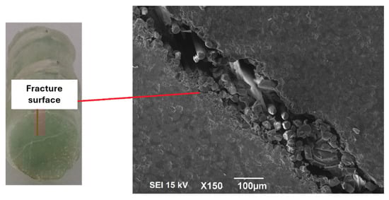 It was observed that the failure of the bars after the interlaminar shear test is characterized by the formation of horizontal cracks along the mid-plane, just below the load application point, propagating toward the ends of the specimen (shear failure), as shown in Figure 4. This allows for the investigation of the effects of aging on the strength of the polymer matrix and the fiber–matrix interface through analysis of the fracture surface.