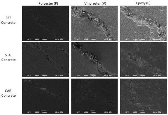Figure 5 shows micrographs obtained by scanning electron microscopy of the fracture surface of GFRP bars exposed to the most severe accelerated aging condition: a temperature of 60 °C for 3000 h.