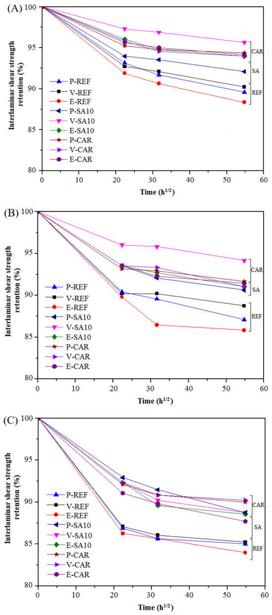 Figure 6C shows that samples of GFRP bars aged in concrete and subjected to 60 °C for 3000 h showed average ISS reductions equal to 15.3%, 11.3% and 10.7%, respectively, maintaining the relative behavior observed in samples exposed to 40 °C and 23 °C. Thus, it is observed that the increase in temperature accelerates the degradation process of GFRP bars inserted in the concrete, regardless of the type of covering concrete and that concretes containing pozzolanic and/or carbonated additions are less aggressive to GFRP bars.