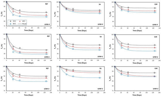 Different prediction models have been established based on the Arrhenius equation to determine the long-term strength of GFRP bars [34]. To predict the reduction in flexural strength of polymer matrix composites exposed to temperatures of 50, 80, and 100 °C, an equation was developed by Phani and Bose [39], that relates the strength at a given time t to the initial bar strength and parameters that account for the exposure temperature. Based on this equation, it is possible to determine the strength retention Tₑᵣ using Equation (5):