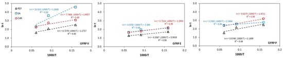 Zhu et al. [34] identified values on the order of 5600 for the Ea/R ratio, while the values obtained in this study ranged from 3330 to 8875. An exception was the high Ea/R value of 21,613 obtained for GFRP bar V protected by SA concrete, which is consistent with the result shown in Figure 7, demonstrating that this combination shows the lowest strength reduction under accelerated aging.