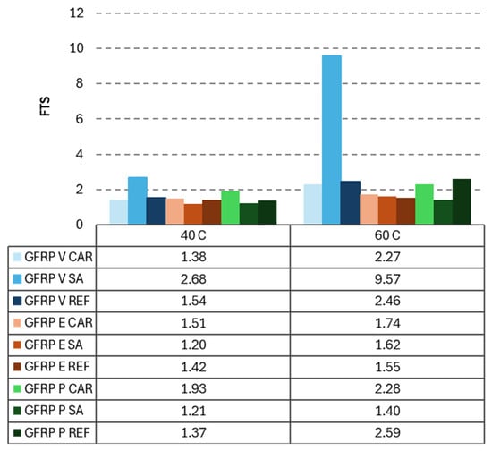 The results presented in Figure 5 indicate that the increase in temperature had an immediate impact on reducing the interlaminar shear strength, since this increase in temperature can affect the fiber-matrix interface. The water molecules that penetrate through the fiber-resin interface have a plasticizing effect and cause hydrolysis reactions, leading to interfacial fracture, according to Equation (3).