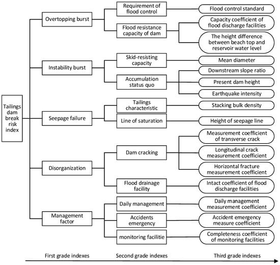 Establishing an accurate, comprehensive, and effective comprehensive indicator evaluation system is the key to assessing dam failure risk. Based on the analysis and research of the main influencing factors, failure modes, and failure paths of tailings dams during operation, parameters and design indicators related to tailings dam safety can be classified, and a preliminary risk index system for tailings dam failure can be established. To determine each specific influencing factor, it is necessary to extensively solicit expert opinions and refer to relevant regulations for formulation, and then organize, classify, and synthesize them. To establish a comprehensive evaluation index system that can reflect the dam-break risk of tailings ponds during their operation from multiple levels and perspectives, and endow it with certain statistical significance [,].