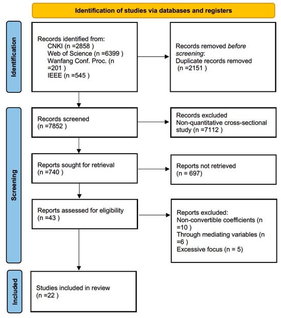 As of May 2025, there were 10,003 literature searches initially identified (2858 from CNKI, 6399 from Web of Science, 545 from IEEE proceedings, and 201 from domestic conferences). After removal of duplicate literature using EndNote 21 software, including duplicate publications of the same experimental results by identical research teams or bilingual duplicate publications of identical articles, 7852 publications remained.