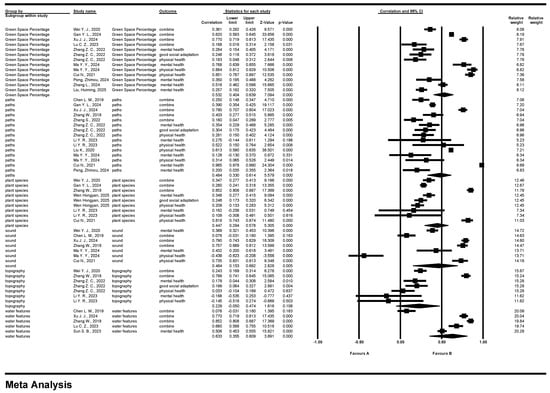 Regarding natural landscape elements in the literature, the most frequently mentioned are paths (n = 27) and landscape ratio (n = 20), followed by plant species (n = 11), sound (n = 11), topography (n = 7), and water features (n = 7). Fewer papers mention color richness (n = 5), animals (n = 3), and sunlight conditions (n = 2), as demonstrated in Figure 5. Due to insufficient dependent variable data, the correlation coefficients for the latter three items are not representative and have been omitted. Analyzing the correlation coefficients reported in different studies using the software, the health benefit values for the top six elements are as follows: water features (0.633) > green space ratio (0.532) > paths (0.484) > sound (0.464) > plant species (0.447) > topography (0.228). This suggests that in the creation of natural environments, blue space (water features) plays a significant regulatory role, while the landscape ratio remains the primary overall consideration, and the planning of landscape paths greatly influences users’ health benefits. However, the p-value for topography is 0.106, indicating non-significance (p > 0.05).