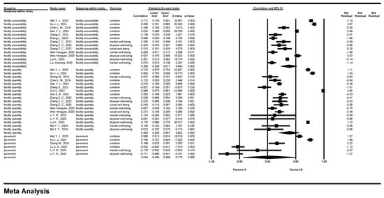 Another limitation lies in the insufficient gender-disaggregated data in current foundational literature. However, preliminary conclusions indicate female behavior and emotions are more susceptible to the external environment, aligning with conclusions from the study “Research on the Emotional and Behavioral Experience of Female Users in University Outdoor Spaces” (He, 2012) [10]. The study involved samples with near-equal gender ratios or unspecified ratios (n = 19), group I (female subjects > male subjects, n = 29), and group II (male subjects > female subjects, n = 18). The reported effect size for group I is 0.379 and for group II is 0.302. The reason for the similar effect sizes may be the relatively small difference in sample sizes and the fact that the research literature represents random sampling outcomes, which did not specifically focus on investigating the impact of gender differences. In future research, greater attention to female needs in spatial design may be an effective pathway to improving overall health benefits.
