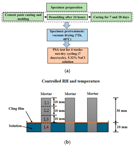 A flowchart for the experiment is shown in Figure 1a. After the cement paste was cast and poured into a mold, specimens with dimensions of 10 × 10 × 40 mm were demolded 24 h after casting and immediately placed in a curing room with a temperature of 20 ± 2 °C and relative humidity of not less than 95%. At 7 days of curing age, 50% of the specimens were randomly selected to terminate curing, while the remaining specimens continued curing to 28 days. This study designed two groups of experiments: the first group maintained a constant water-to-cement ratio of 0.4 with curing ages of 7 days and 28 days, respectively, aimed at investigating the effect of curing age on PSA; the second group had a curing age of 28 days with water–cement ratios of 0.4, 0.45, and 0.5, respectively, used to study the effect of water–cement ratio on PSA. When reaching the designed curing age, the specimens were placed in a vacuum drying oven at 40 °C for 72 h of drying, followed by a PSA test. The semi-immersion setup is shown in Figure 1b, with 1/4 of the specimen immersed in the solution. To ensure solution concentration stability during immersion, the NaCl solution was replaced every 1–2 days, and plastic wrap was placed over the salt solution surface to suppress water evaporation. The dry–wet cycling of the experiment was set based on the accelerated cycling procedure proposed by Lubelli [28] to promote more sub-florescence crystallization and better correspond to actual engineering conditions, with each complete cycle lasting 7 days. The detailed settings of the cycling procedure in each cycle are presented in Table 2.