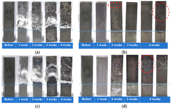 Macroscopic morphology of cement pastes partially immersed in NaCl solution (blue dashed line indicates the immersion line; red dashed circles indicate the deterioration region). Crystallization development over immersion time for specimens cured for 7 days (a) and for 28 days (c); appearance changes over immersion time after removal of external crystals for specimens cured for 7 days (b) and for 28 days (d).