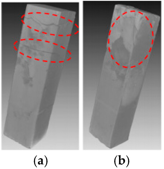 Figure 7 and Figure 8 compared the internal damage characteristics of the cement pastes with water-to-cement ratios of 0.4, 0.45, and 0.5 after 4 weeks of PSA erosion. The XCT results in Figure 7 showed that all three pastes exhibited surface spalling. Analysis of three representative cross-sections from specimen side surfaces to interiors (Figure 8) revealed that although no obvious penetrating cracks were observed inside any of the three paste specimens, the specimens with higher water-to-cement ratios (0.45 and 0.5) experienced severe spalling at edges, resulting in corner loss. Among these, the specimens with a water-to-cement ratio of 0.5 showed the most significant damage. This can be attributed to the higher water-to-cement ratio specimens having higher porosity and larger pore sizes [19], thus allowing NaCl solution to penetrate more easily into the interior of the cement-based materials. With the progress of PSA cycling, crystallization products gradually accumulated in the specimen surface layers, and when the generated crystallization pressure exceeded the local tensile strength of the material, more severe surface spalling ultimately occurred.