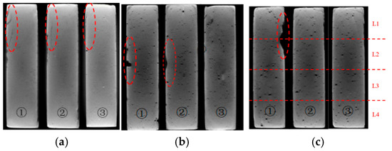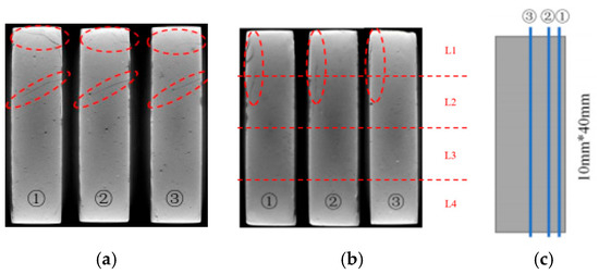 Internal slice images of the specimen partially immersed in NaCl solution for 4 weeks (red dashed circles indicate the deterioration region): (a) specimens with a curing age of 7 days; (b) specimens with a curing age of 28 days; (c) schematic diagram indicating the positions for the internal slices.