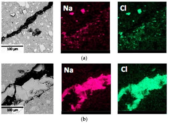 In Figure 5, BSE images and Na, Cl elemental distribution maps in the L1 region (Figure 1) of the specimens were investigated to further observe the influence of NaCl crystallization distribution on material deterioration. It can be seen that obvious deterioration was observed near the surface of the specimens, and the precipitated NaCl crystals exhibited characteristics of relatively large size and concentrated distribution, corresponding to significant damage in the specimen surface layer. In contrast, no large-sized and concentrated NaCl crystals were observed in the internal regions of the specimens, and therefore, no obvious crack structures were found. These experimental results confirmed that during the PSA, when NaCl crystals precipitate at certain locations in specimens that are relatively large and concentrated in distribution, deterioration is prone to occur at those locations. This finding provides microscopic-level evidence for understanding salt crystallization attack mechanisms, indicating that crystal size and distribution density are key factors affecting the deterioration level.