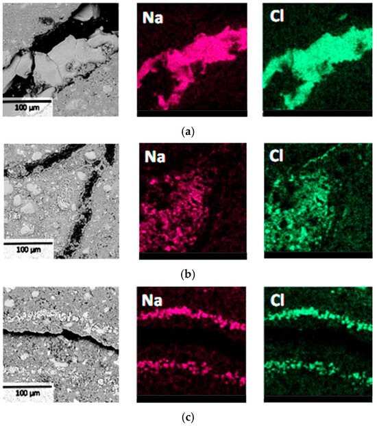 The BSE and EDS results of the specimens are shown in Figure 9. The results indicated that all three specimens with water-to-cement ratios of 0.4, 0.45, and 0.5 exhibited concentrated distribution of NaCl crystals with relatively large crystal sizes near surface deterioration regions. Notably, no NaCl crystallization with similar characteristics was observed in the undamaged internal areas of all the specimens. These results demonstrated that the macroscopic failure of specimens had a significant correlation with NaCl crystal formation and their distribution locations. Although the three groups of specimens had different water-to-cement ratios, the deterioration mechanisms remained essentially consistent [28], all caused by local stress concentration resulting from NaCl crystallization in surface regions. Therefore, it can be inferred that changes in water-to-cement ratio primarily affect the material’s resistance to PSA damage rather than altering its fundamental deterioration mechanism. This provides a theoretical foundation for establishing more rapid and effective laboratory PSA evaluation methods.