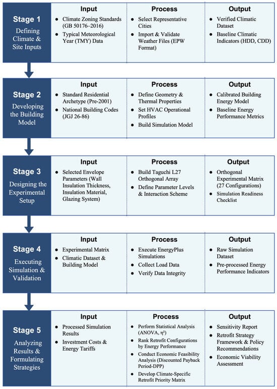 This study proposes a simulation-based framework to evaluate climate-adaptive energy retrofit strategies for aged residential buildings across China’s five climate zones. The framework consists of five sequential stages to ensure methodological rigor and replicability.