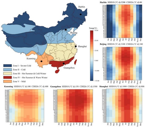 To represent each zone, one city was selected based on three criteria: climatic representativeness, availability of validated meteorological data, and practical relevance to residential retrofitting at the urban scale. The five cities chosen—Harbin, Beijing, Shanghai, Guangzhou, and Kunming—are widely recognized as benchmark locations for each thermal zone classification.
