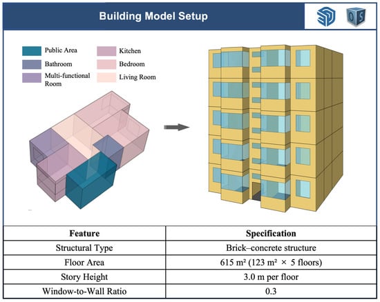A single building archetype was chosen for simulation to ensure a consistent basis for cross-regional comparison and to reflect the most prevalent form of pre-2001 residential construction in Chinese cities. The year 2001 was chosen as a cutoff because before this date, most residential buildings in China were constructed without mandatory energy efficiency standards. Regional energy codes were only introduced in the late 1990s and early 2000s, making pre-2001 buildings a key target for retrofit due to their low thermal performance. This archetype—three to six stories, brick–concrete structure, no elevator, and no insulation—is the most prevalent form of urban residential building constructed between 1980 and 2001 [34]. These buildings have low thermal performance due to the absence of insulation and outdated glazing systems and continue to dominate a large share of the existing building stock in Chinese cities [34].