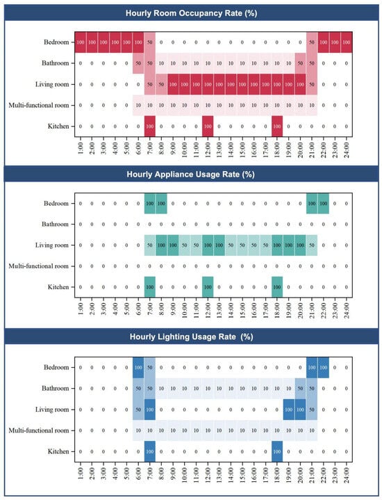 Typical hourly distributions of room occupancy rate, appliance usage rate, and lighting usage rate.