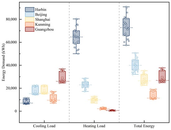 This variation reflects climate-driven retrofit sensitivity. In severe cold zones like Harbin and Beijing, envelope retrofits—especially thick insulation and high-performance glazing—substantially mitigate heating loads, leading to larger variance across retrofit cases. Shanghai, representing a transitional climate, shows moderate variability (standard deviation: 4457 kWh), reflecting dual sensitivity to heating and cooling loads. Guangzhou and Kunming show lower dispersion (SD: 3598 and 2336 kWh, respectively), as their energy use is dominated by cooling or remains low overall.