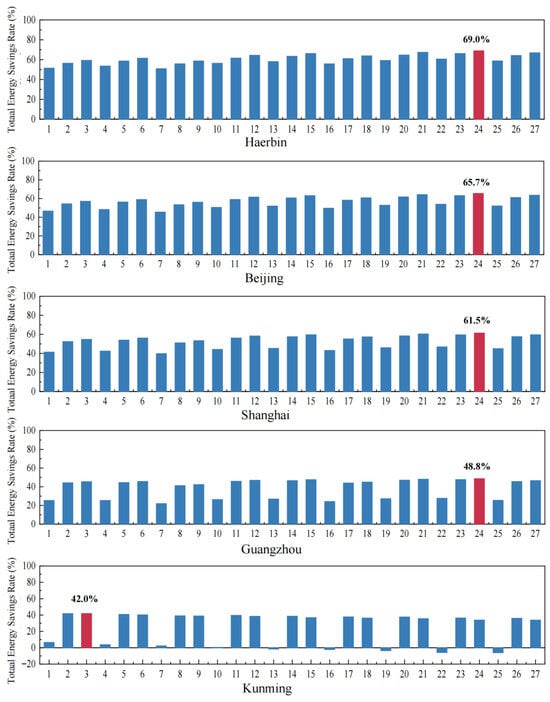 Figure 7 compares the optimal configuration—defined as the lowest energy demand scenario from the L27 matrix—for each city. For Harbin, Beijing, Shanghai, and Guangzhou, the same configuration (No. 24) was most effective, yielding energy demands of 57,441, 32,067, 22,577, and 24,852 kWh, respectively. Compared to their baselines, these values represent relative savings of 69.0%, 65.7%, 61.5%, and 48.8%. Kunming, in contrast, achieved its lowest energy use (10,396 kWh) using Configuration No. 3, a lighter intervention, saving 42.0%.