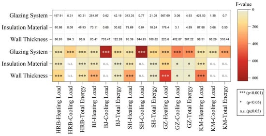 To statistically evaluate the impact of various envelope parameters on energy performance, one-way ANOVA tests were performed for each city, assessing the effects of wall insulation thickness, insulation material, and glazing system on annual heating load, cooling load, and total energy consumption. Figure 8 summarizes the resulting F-values, p-values, and statistical significance across all cases.