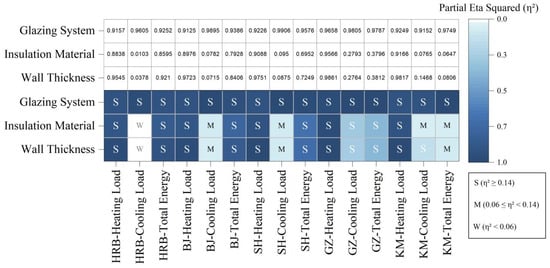 To complement the significance testing results, a sensitivity analysis using partial eta squared (η2) was conducted to quantify the proportion of variance in energy performance attributable to each envelope parameter. This approach enables a direct comparison of effect sizes, clarifying which retrofit measures exert the strongest influence in various climatic contexts [48].